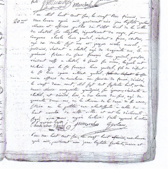 ![]() Acte de baptême de François-Louis. Acte de décès déclaré par son frère Charles-Louis. "Châtel-sur-Moselle pendant la révolution", l'ouvrage de l'abbé Olivier a inspiré la biographie ci contre. A noter une erreur généalogique importante de l'abbé Olivier lorsqu'il écrit que François-Louis GAUDEL descend de François et non pas de Claude son frère. |
