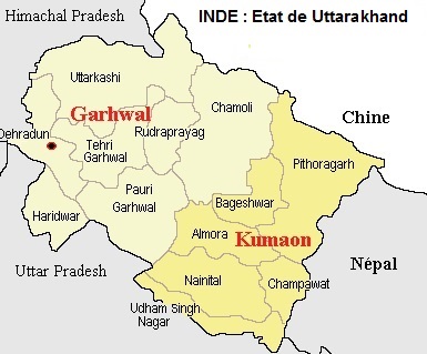8-Uttarakhand is an Indian state located in the Himalayan Mountain range. It is surrounded by Tibet in the North-East, and Nepal in the South-East. People coming from Uttarakhand call themselves Pahari (meaning the people of the hills) and are Hindus. Uttarakhand is made of two territorial divisions : the Garhwal division in the West and the Kumaon divison in the East.